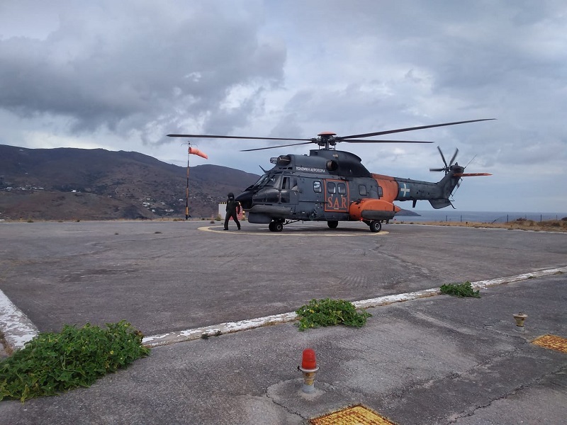Φωτογραφία από το πρωινό συμβάν. Ελικόπτερο της πολεμικής αεροπορίας έφτασε σήμερα Δευτέρα 11/10 στο ελικοδρόμιο της Άνδρου για να παραλάβει ηλικιωμένο ασθενή (με πιθανό ισχυρό αλλεργικό σοκ) από το Κόρθι. Το ελικόπτερο έφτασε στις 9:45. Παρέλαβε τον ασθενή. Και έφυγε στις 10:15 με κατεύθυνση τη Σύρο και το εκεί νοσοκομείο.