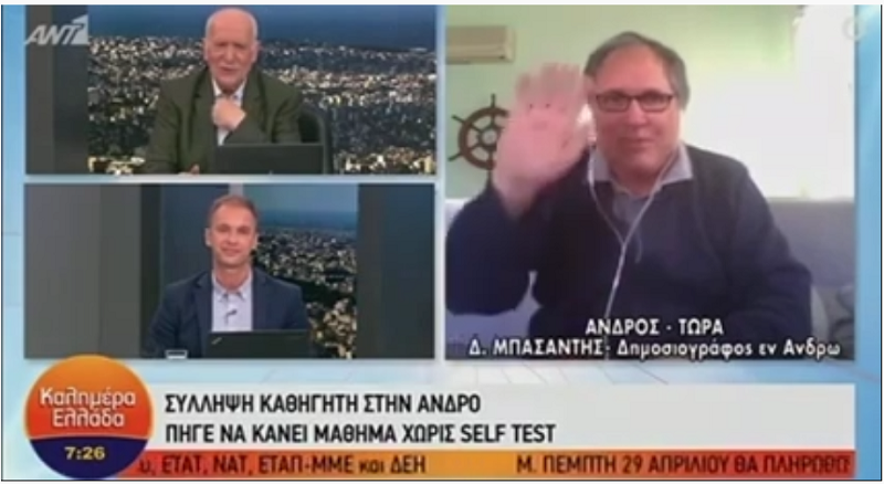 Από το μεσημέρι της Τετάρτης 21/5 – όταν διέρρευσε η είδηση σχετικά με καθηγητή σε Λύκειο της Άνδρου που αρνήθηκε να κάνει το self-test και έκλεισε το σχολείο για να μην θέσει τα παιδιά σε κίνδυνο – η Άνδρος προσέλκυσε το ειδησεογραφικό ενδιαφέρον των αθηναϊκών ΜΜΕ. Ήταν μια σπάνια είδηση. Μέχρι σήμερα δεν είχε παρουσιαστεί… Continue reading Στον ΑΝΤΕΝΝΑ και στον ΓΙΩΡΓΟ ΠΑΠΑΔΑΚΗ για την “άρνηση self test” στην Άνδρο!…