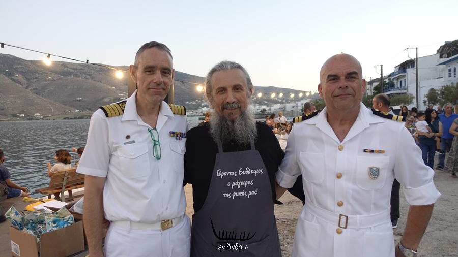 Από τις εκδηλώσεις για τη Ναυτική Εβδομάδα τον Ιούλιο του 2025. Ο πλοίαρχος Λ.Σ. Γιάννης Θεοχάρης (αριστερά) στο εορταστικό κλείσιμο της με την Ψαράδικη Βραδιά στο Κόρθι με τον πατέρα Αέτιο και τον ανθυποπλοίαρχο Λ.Σ. Στάθη Κωστόπουλο (δεξιά).