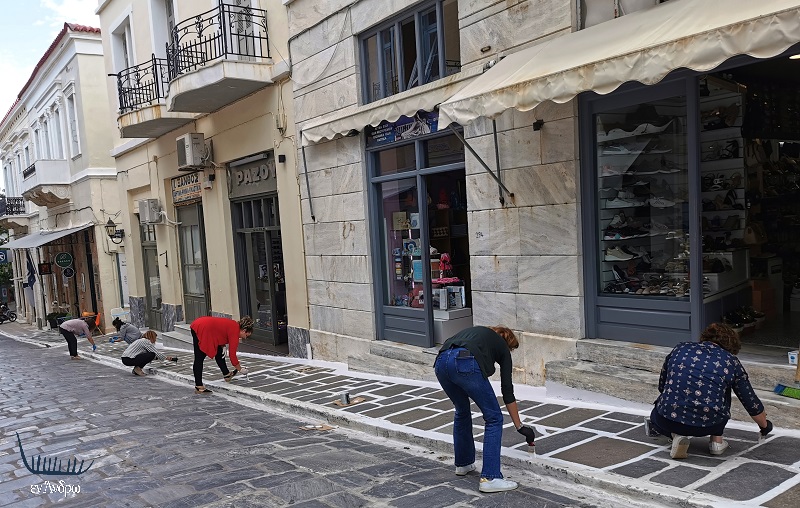 ΑΓΟΡΑ Εικόνα εντυπωσιακή. Έξι καταστήματα στη σειρά και έξι καταστηματάρχισες… εν σειρά! Όλες μαζί να βάφουν το πεζοδρόμιο τους… στον πεζόδρομο!!! Δευτέρα 25 Μαΐου 2020. Άνοιξαν πρώτη μέρα και έδειξαν την νοικοκυροσύνη τους. Η Άνδρος που αγαπάμε…