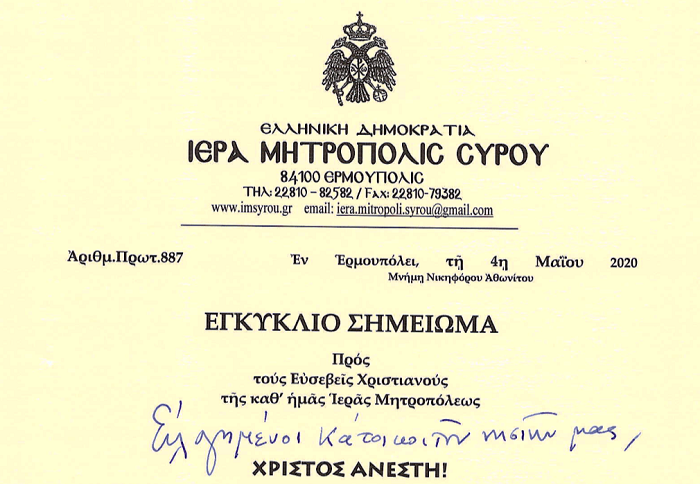 ΙΕΡΑ ΜΗΤΡΟΠΟΛΙΣ ΣΥΡΟΥ ΕΓΚΥΚΛΙΟ ΣΗΜΕΙΩΜΑ Εὐλογημένοι κάτοικοι των νησιῶν μας ΧΡΙΣΤΟΣ ΑΝΕΣΤΗ! Τό ἐφετεινό Πάσχα ἦταν Πάσχα πολλαπλῆς δοκιμασίας γιά ὅλους μας!