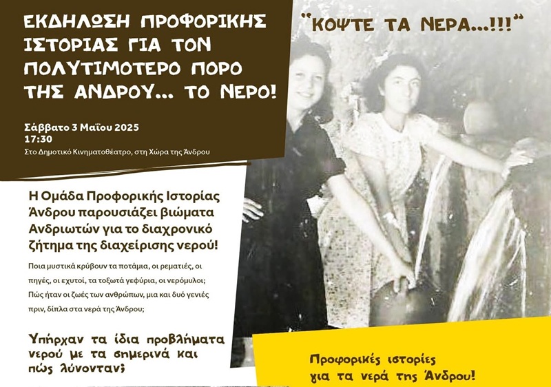 Το Σάββατο 3 Μαΐου 2025, στο κατάμεστο Δημοτικό Κινηματοθέατρο Άνδρου, πραγματοποιήθηκε με επιτυχία η εκδήλωση της Ομάδας Προφορικής Ιστορίας Άνδρου, με θέμα «Άνθρωποι και Μνήμη: Η διαχρονική διαχείριση του νερού στην Άνδρο».