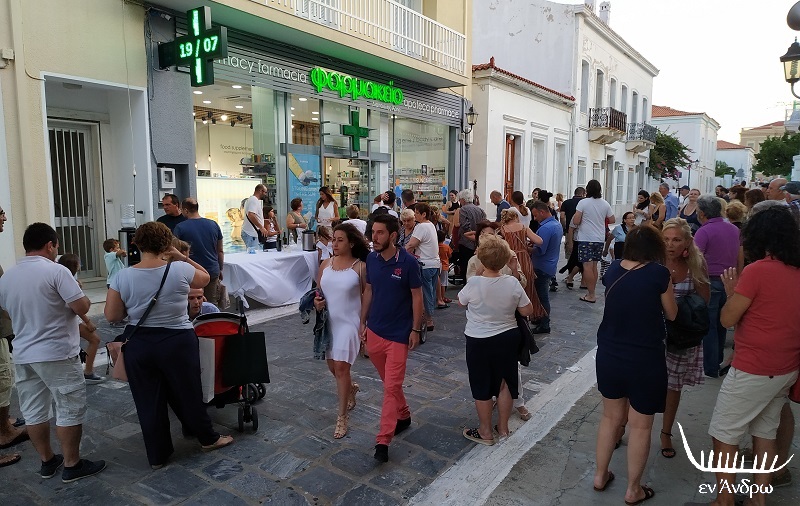 Και ξαφνικά γέμισε κόσμο η γειτονιά. Στο πάνω μέρος του πεζόδρομου στη Χώρα είχε εγκαίνια το ανακαινισμένο και ανανεωμένο – στη νέα του θέση – φαρμακείο. Βγήκαν τραπέζια στο δρόμο. Ήρθε κόσμος. Και άρχισε και μια εξαιρετική συναυλία τζαζ από ένα εξαιρετικό τρίο!!! Κάτι από χρώμα Νέας Ορλεάνης στην Άνδρο!…