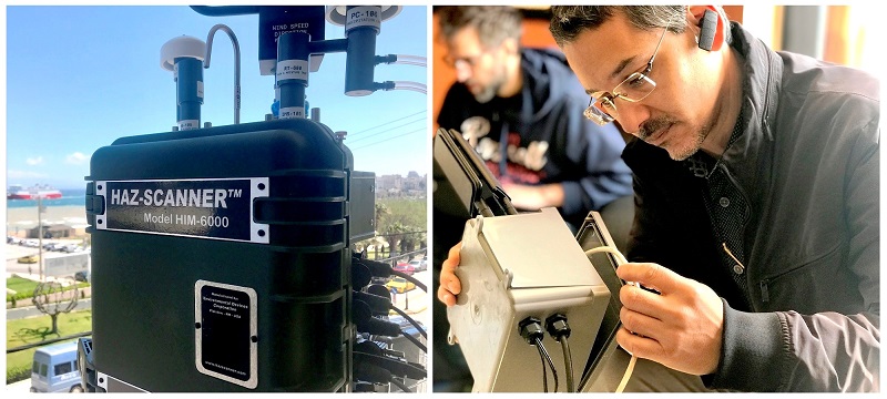 Αριστερά ο σταθμός μέτρησης της ρύπανσης στο λιμάνι της Ραφήνας. Δεξιά ο καθηγητής Ανδρέας Βασιλόπουλος που τον εγκαθιστά.
