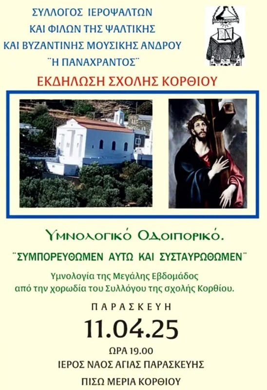 Σύλλογος Ιεροψαλτών και φίλων Ψαλτικής και Βυζαντινής Μουσικής Άνδρου “Η Πανάχραντος” Καθώς πλησιάζουμε στην Αγία και Μεγάλη Εβδομάδα ,την κατεξοχήν περίοδο της κατανύξεως και της σωτηριώδους θυσίας του Κυρίου , η Εκκλησία μας καλεί να συμπορευθούμε μαζί Του στον δρόμο του Θείου Πάθους . Να Τον ακολουθήσουμε με ταπείνωση, να Τον συναντήσουμε στον Σταυρό και… Continue reading “Συμπορευθώμεν αυτώ και συσταυρωθώμεν”