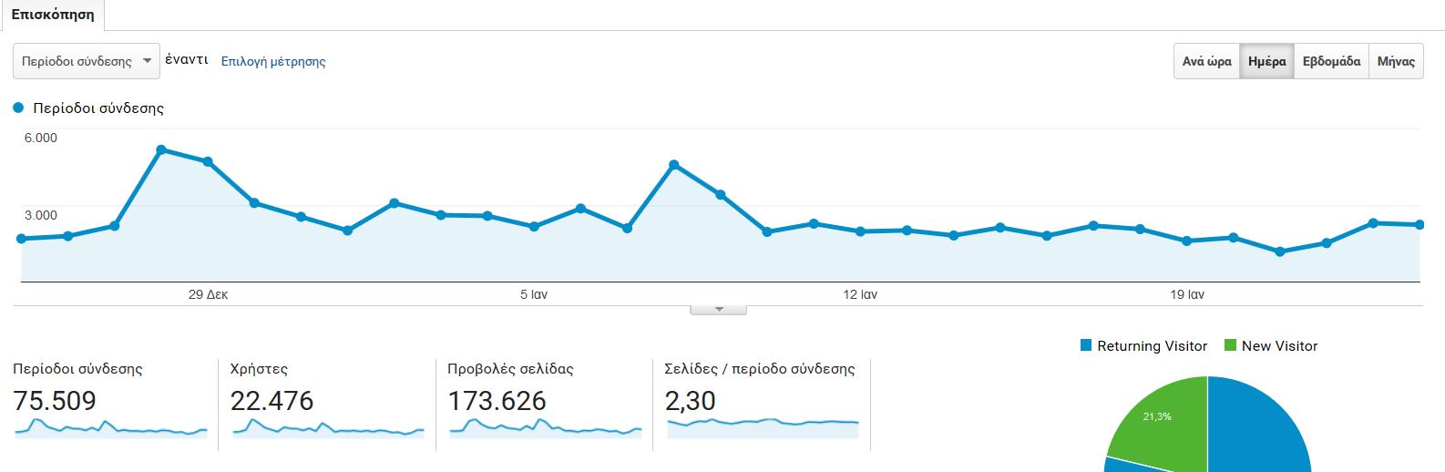 Google Analytics: Επισκεψιμότητα/αναγνωσιμότητα 30 τελευταίων ημερών. 25 Δεκεμβρίου 2016-24 Ιανουαρίου 2017. Ήτοι, μέσος όρος 2436 εισόδους επισκεπτών την ημέρα!!! Μοιάζει κάπως εξωπραγματικό ένα νησιώτικο site, που απευθύνεται ως εκ της φύσεως του σε στοχευμένο ακροατήριο, κατοίκους ή ανθρώπους που έχουν σχέση με το νησί ή απλώς αγαπά την Άνδρο, να επιτυγχάνει νούμερα που θα ζήλευαν… Continue reading Μεγάλη άνοδος του Εν Άνδρω: Ευχαριστούμε τους αναγνώστες μας