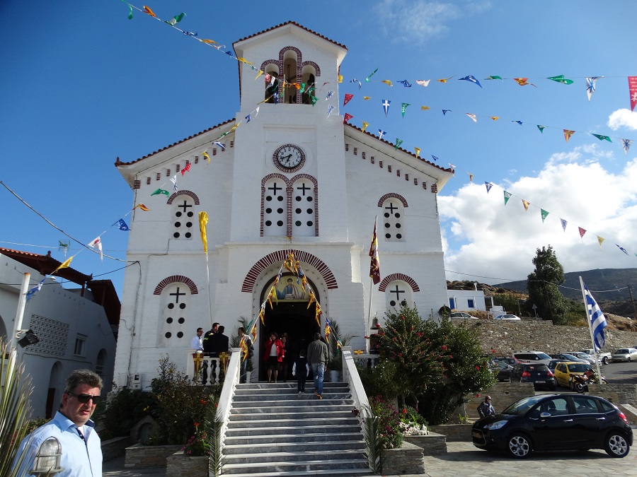 Ο Άγιος Φίλιππος σημαιοστολισμένος ανήμερα στην γιορτή του (φωτ. Εν Άνδρω). Χρόνια άκουγα για την γιορτή του Αγίου Φιλίππου στο Μπατσί. Δεν είχε όμως τύχει να πάω. Έτσι όταν με πήρε τηλέφωνο να με καλέσει στην γιορτή ένας δημοτικός σύμβουλος ξαφνιάστηκα. Τον ευχαρίστησα κι είπα «θα προσπαθήσω».