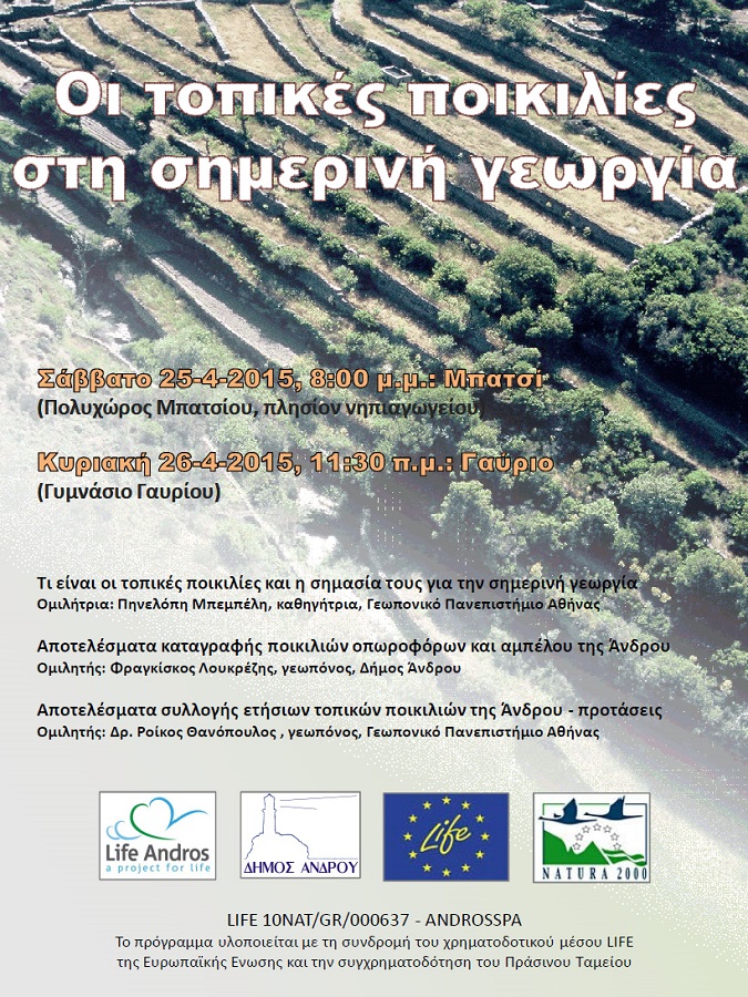 Ο Δήμος Άνδρου, το πρόγραμμα LIFE’Ανδρου και το Γεωπονικό Πανεπιστήμιο Αθηνών διοργανώνουν το Σαββατοκύριακο 25-26 Απριλίου ημερίδα, με θέμα “Τοπικές ποικιλίες στη σημερινή γεωργία”. Οι ημερίδες θα πραγματοποιηθούν το Σάββατο, 25 Απριλίου, στις 8 το βράδυ στον Πολυχώρο Μπατσίου (πλησίον του νηπιαγωγείου) και την Κυριακή, 26 του μήνα, στις 11.30 το πρωί, στο γυμνάσιο Γαυρίου.