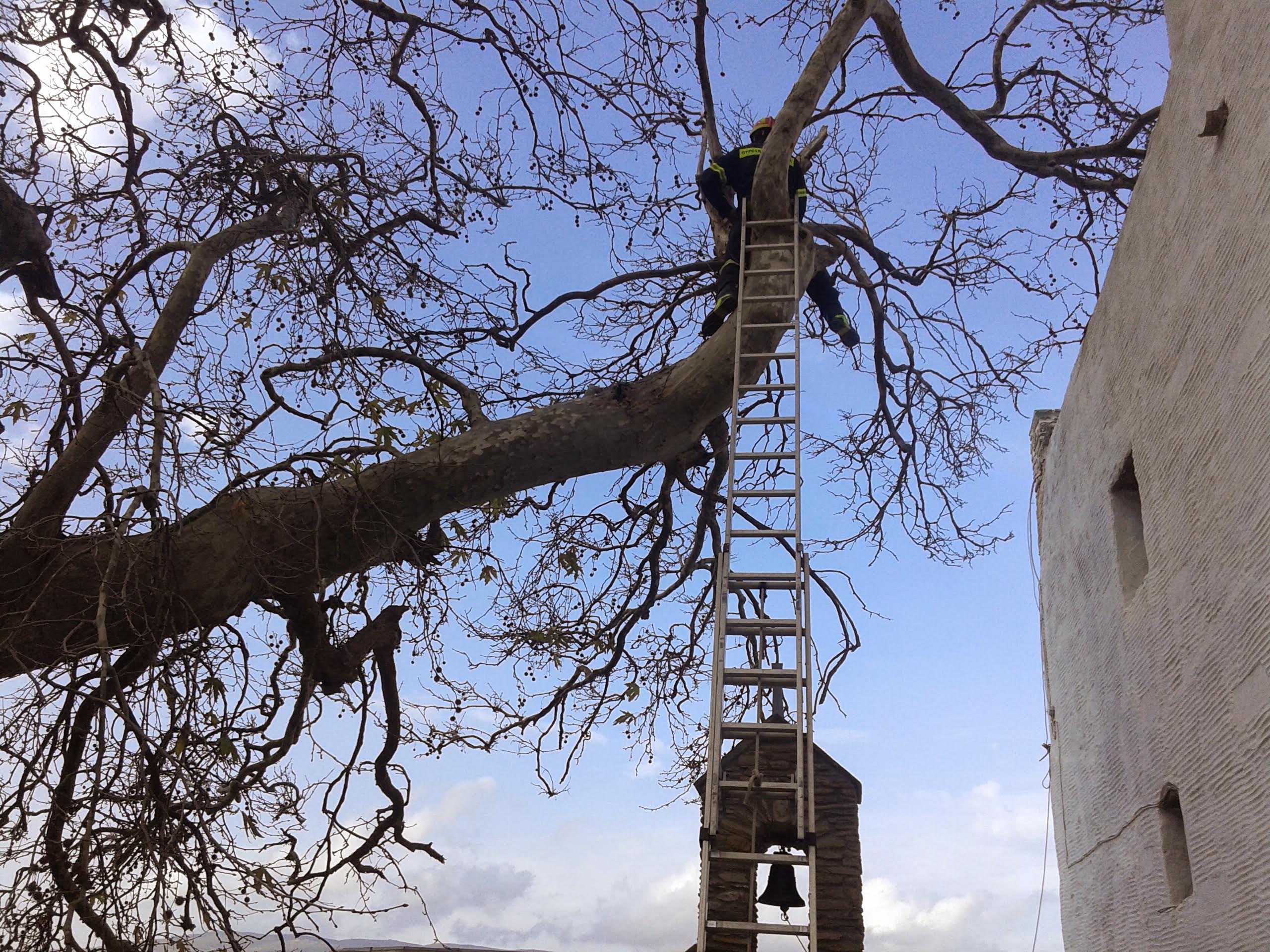 Σε ύψος 12 μέτρων ο πυροσβέστης καθαρίζει το δέντρο. Έξι ώρες η πυροσβεστική Άνδρου τη Τετάρτη 3/12 κλάδευε τα δύο τεράστια πλατάνια 800 και πλέον ετών, τα οποία δεσπόζουν στον αυλόγυρο της Μονής Παναχράντου. Με δεξιοτεχνία και επαγγελματισμό οι πυροσβέστες πέτυχαν να κατεβάσουν τεράστια κομμάτια κλαδιών βάρους εκατοντάδων κιλών το καθένα από ύψος 12 μέτρων,… Continue reading Κλαδεύοντας ιστορία 800 και πλέον χρόνων!