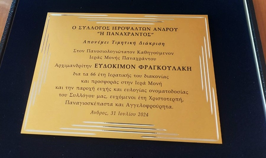 Του Κώστα Λιοπύρου Προέδρου Ιεροψαλτών Ανδρου Η τιμητική πλακέτα του Συλλόγου Ιεροψαλτών Άνδρου προς τον ηγούμενο της Μονής Παναχράντου Ευδόκιμο. (Απόσπασμα από την ομιλία του προέδρου Συλλόγου Ιεροψαλτών Άνδρου) Σήμερα εδώ τιμούμε τον Άξιο Καθηγούμενο της Ιεράς Μονής Παναχράντου Αρχιμανδρίτη , τον Αγαπητό σε όλους Πατέρα Ευδόκιμο γιατί μας ευλόγησε και… Continue reading Τιμήθηκε για την μεγάλη προσφορά του στην Άνδρο ο ηγούμενος της Μονής Παναχράντου Ευδόκιμος.