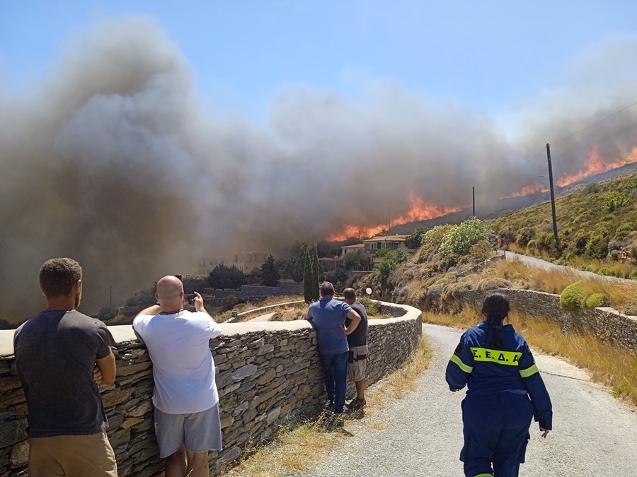 Το Υψηλού στις φλόγες το απομεσήμερο της 22ας Ιουνίου 2024. Κάτοικοι της περιοχής με επιστολή τους ευχαριστούν δημόσια την μάχη με την φωτιά που έδωσαν τα μέλη του Συλλόγου Εθελοντών Πυροσβεστών Άνδρου. Στην φωτογραφία κάτοικοι και επισκέπτες της Άνδρου παρακολουθούν την τρομερή εικόνα, ενώ μια εθελόντρια του ΣΕΔΑ σπεύδει προς την φωτιά.
