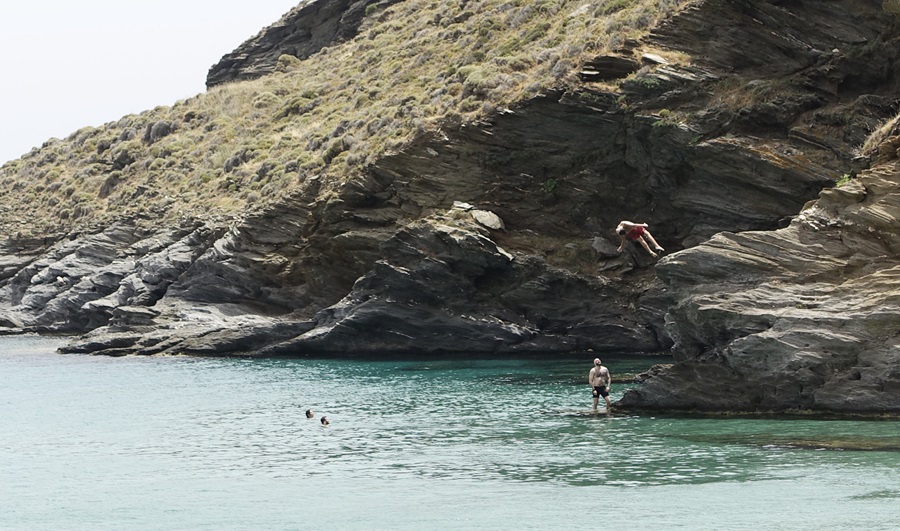 ΒΟΥΤΙΕΣ ΣΤΑ ΓΥΑΛΙΑ Νερά κρυστάλλινα. Πρασινογάλαζα. Γυάλια. Λίγο μετά τον καύσωνα. Οι επισκέπτες κάνουν βουτιές από τα βράχια. Το καλοκαίρι είναι εδώ…