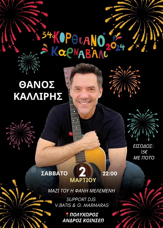 Με αφορμή το άνοιγμα το Τριωδίου, σας περιμένουμε στο καθιερωμένο πάρτυ του Κορθιανού Καρναβαλιού στον Πολυχώρο της ΑΝΔΡΟΣ ΚΟΙΝΣΕΠ το Σάββατο 2/3/2024 στις 22:00 ! Καλεσμένος μας ο Θάνος Καλλίρης ! Μαζί του η Φανή Μελεμένη! Πλαισιώνουν τη βραδιά οι DJs : V. Batis & G.Marmaras Είσοδος :15 ευρώ με ποτό Σας περιμένουμε όλους !