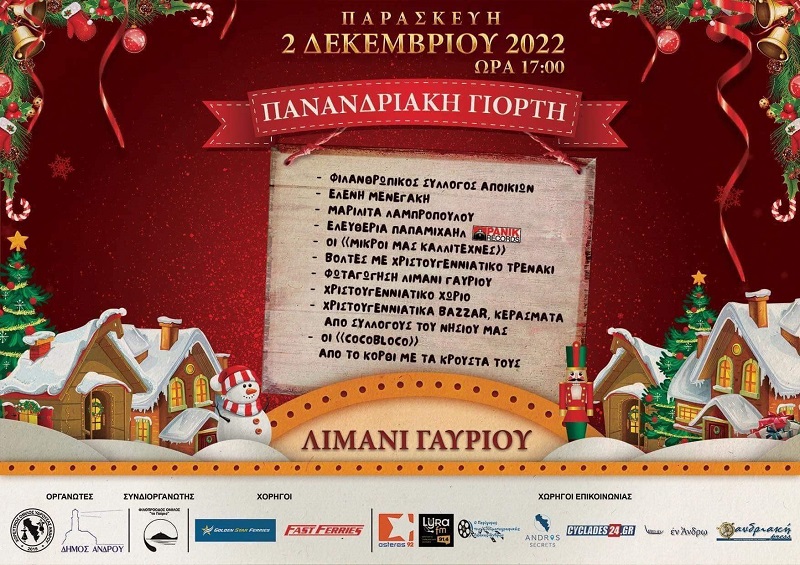 Αφίσα με τους συμμετέχοντες στην Πανανδριακή Εορτή και με τους χορηγούς της. Η αντίστροφη μέτρηση έχει αρχίσει. Ήρθε η ώρα να γιορτάσουμε όλοι στο Χριστουγεννιάτικο Γαύριο!!! Στο Χριστουγεννιάτικο Γαύριο από αύριο γίνεσαι πάλι παιδί! Ελάτε να χαθούμε όλοι μαζί στη Μαγεία των Χριστουγέννων! Σας περιμένουμε 2 Δεκεμβρίου από τις 17:00.