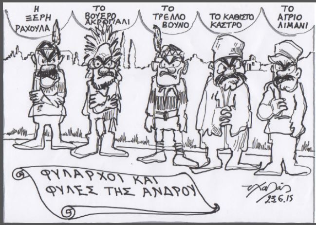 Του Διαμαντή Μπασαντή Τα φέουδα της Άνδρου το 1537 (σκίτσο Τάσου Χαλά από Μπατσί). Όλοι ξέρουμε πως το τείχος του Βερολίνου διήρκεσε μόνο 40 χρόνια. Και έπεσε πριν 25 χρόνια. Έκτοτε μόνο δύο τείχη έχουν απομείνει στην Ευρώπη: το ορατό τείχος της Λευκωσίας στην Κύπρο και το αόρατο τείχος της Υδρούσας στην Άνδρο!!! Της Λευκωσίας χωρίζει… Continue reading Φέουδα και φυλές της Άνδρου!!!
