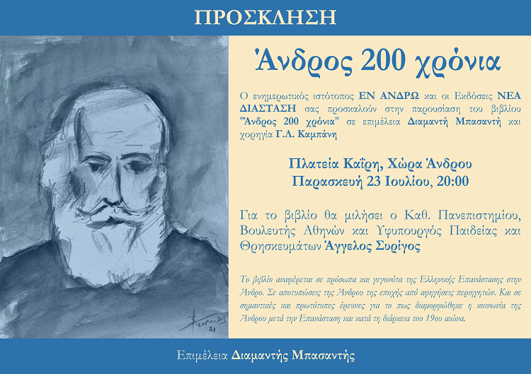 Το βιβλίο θα παρουσιάσει ο υφυπουργός για την Ανώτατη Παιδεία Άγγελος Συρίγος την Παρασκευή 23 Ιουλίου 2021 στις 20:00 στην πλατεία Θ. Καΐρη Ήρθε η ώρα να γνωρίσει κάθε ένας καλύτερα τους προγόνους του, τον τόπο του, το χωριό του. Πέρα από αφηγήσεις ή μαρτυρίες που μερικές φορές από στόμα σε στόμα και από εποχή σε… Continue reading Βρείτε τους προγόνους σας και γνωρίστε το “βιογραφικό” της Άνδρου του 19ου αιώνα…
