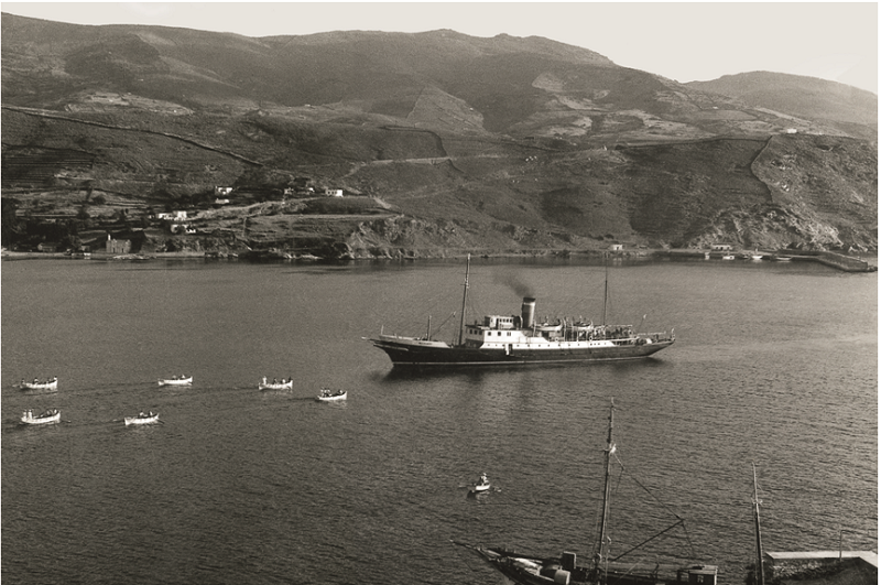Το Μοσχάνθη στη δεκαετία του 1950 στην Χώρα. Οι βάρκες πλησιάζουν για να κατεβάσουν τους επιβάτες (αρχείο Αντώνη Πολέμη). Το «Μοσχάνθη» ναυπηγήθηκε το 1913 στη Σκωτία ως θαλαμηγός. Αμέσως μετά τον πόλεμο μετασκευάστηκε σε επιβατηγό και το 1947 αγοράστηκε από τον εφοπλιστή Ιωάννη Τόγια, οπότε πήρε και το όνομα «Μοσχάνθη».
