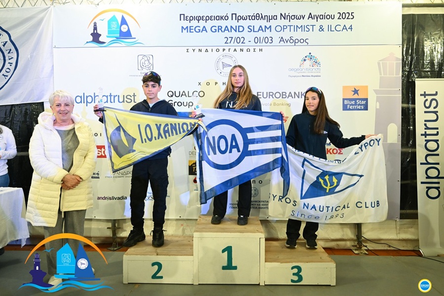 Η αθλήτρια του Ναυτικού Ομίλου Άνδρου Σύλια Κανέλλου Κοκκινάκη ήταν το «αστεράκι» του ΝΟΑ αλλά και του Περιφερειακού Πρωταθλήματος Νήσων Αιγαίου και Κρήτης Mega Grand Slam στις κατηγορίες Optimist και ILCA 4. Στη φωτογραφία η πρώτη της γενικής κατάταξης Κανέλλου Κοκκινάκη Σύλια (Ν.Ο.Ανδρου), ο δεύτερος Διακάκης Γαβριήλ (Ι.Ο.Χανίων) και η τρίτη Μπουγιούρη Δάφνη (Ν.Ο.Σύρου).