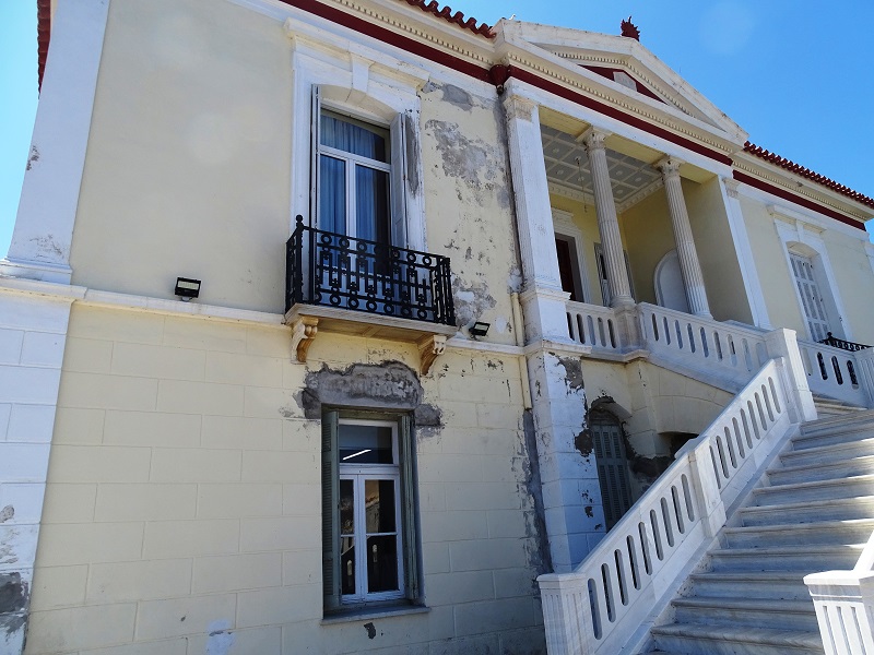 Η καταρρέουσα πρόσοψη του δημαρχείου Άνδρου. Σε αυτή την σκάλα έγινε η ορκωμοσία Σουσούδη και του τότε Δημοτικού Συμβουλίου το 2014. Το κτίριο που συντηρήθηκε το 2012 – επί Γλυνού – το 2014 ήταν ακόμα σε καλή κατάσταση. Έτσι έγινε η ορκωμοσία. Έκτοτε και επί 5ετία δεν μπήκε πινελιά. Ιδού πως είναι σήμερα… Τον Α.…