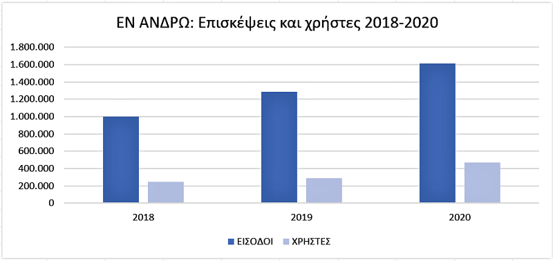 Εντυπωσιακή άνοδο από το 2019 στο 2020 κατά 20% σε επισκέψεις και κατά 40% σε χρήστες είχε το ΕΝ ΑΝΔΡΩ!!! Αναλυτικά, από 1.285.052 επισκέψεις το 2019 φτάσαμε 1.612.723 το 2020!!! Περισσότερες κατά 327.671 επισκέψεις και 186.631 χρήστες σε ένα χρόνο!!!
