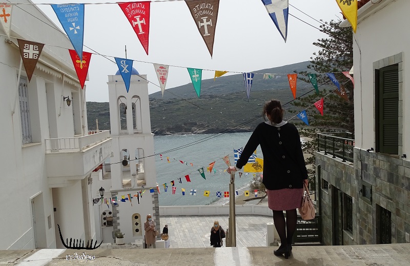 Σχεδόν άδειο το προαύλιο την ώρα της λειτουργίας και εντελώς άδειο αμέσως μετά το τέλος της λειτουργία. Δεν έγινε λιτανεία, δεν υπήρξαν στεφάνια και παρέλαση. Στην φωτογραφία η βουλευτής Κατερίνα Μονογιού, αριστερά, ανεβαίνει τις σκάλες. Αγνώριστη με την μάσκα!!!