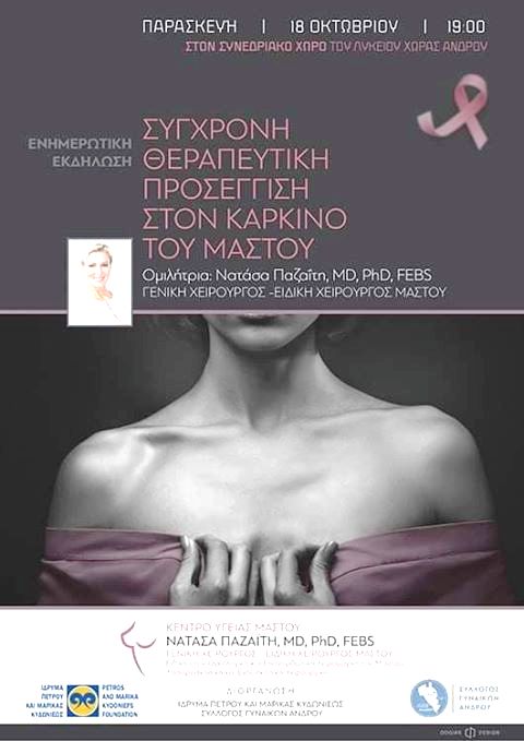 Αύριο Παρασκευή στις 7 το απόγευμα η Νατάσα Παζαΐτη, σύζυγος του πρώην πρωθυπουργού Κώστα Καραμανλή, μιλά στη Χώρα με θέμα τον καρκίνο του μαστού. Είναι ένα κίνητρο πως μια γνωστή ομιλήτρια έρχεται στην Άνδρο. Μπορεί να προσελκύσει το ενδιαφέρον ενός ευρύτερου ακροατηρίου και να γίνει μεγαλύτερη ενημέρωση για ένα ζήτημα που αφορά όλες τις γυναίκες…