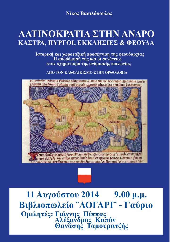 Την Τετάρτη 13 Αυγούστου και ώρα 7.00 στην αυλή του Δημοτικού Θεάτρου στη Χώρα θα παρουσιαστεί το βιβλίο του Νίκου Βασιλόπουλου: Λατινοκρατία στην Άνδρο – Κάστρα, Πύργοι, Εκκλησίες & Φέουδα. Θα μιλήσουν οι: Νικολός Βογιαζίδης, Κατερίνα Δημητρίου, Χαρούλα Κριεζή-Σβυριάδου.