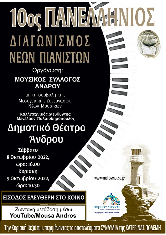Καλησπέρα σας, Σας στέλνουμε την αφίσα του 10ου Πανελληνίου Διαγωνισμού Νέων Πιανιστών που έχει προγραμματιστεί για τις 08 και 09 Οκτωβρίου 2022 στο Δημοτικό Θέατρο Άνδρου.