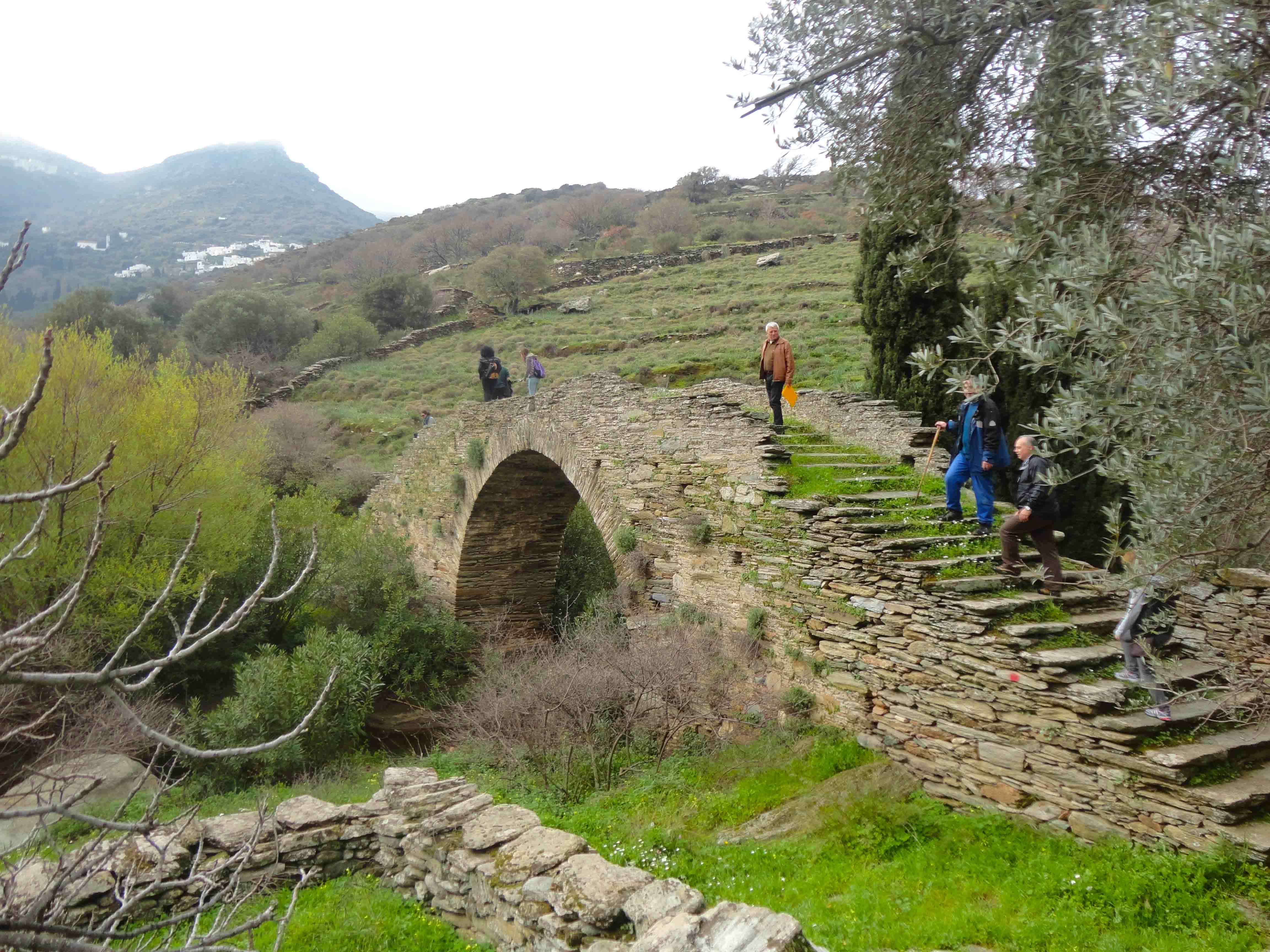 Η πορεία μέχρι το γεφύρι εύκολη. Γρήγορη κατάβαση από ένα καλοδιατηρημένο μονοπάτι. Το γεφύρι σπουδαίο. Τοξωτό. Λιθόκτιστο. Από κάτω έτρεχε το νερό του «μεγάλου ποταμού των Λειβαδίων». Άφθονο. Είναι η εποχή που ο τόπος έχει νερά. Η μέρα πολύ καλή για περπάτημα. Βοήθαγε η συννεφιά. Η ξενάγηση εξαιρετική. Μάθαμε από το γιατί φτιάχτηκε το γεφύρι μέχρι τι σημαίνει «κοινόχρηστος δρόμος» στην εποχή του άρχοντα Νικολό Ντε Καμίλο που το έφτιαξε. Μάθαμε και τι κινδύνους αντιμετωπίζει σήμερα μιας και το πέτρινο «κλειδί» έχει αρχίσει να πέφτει και χρειάζεται στερέωση.