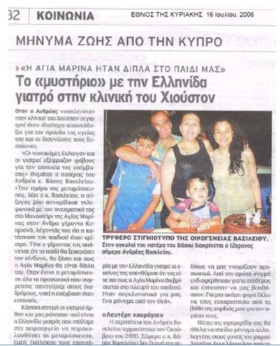 Τρίτον, εκτός από την παράδοση και τα θαύματα πολλοί χριστιανοί στην Κύπρο αφηγούνται την ιστορία που έγινε γνωστή στην Κύπρο το 2000. Εκείνη την χρονιά ο μικρός Ανδρέας Βασιλείου από την Κύπρο βρέθηκε στο Χιούστον των ΗΠΑ για μια λεπτή χειρουργική επέμβαση. Ο Ανδρέας έπασχε τότε από λευχαιμία και είχε γίνει έκκληση για την εξεύρεση δότη για μεταμόσχευσης μυελού. Στο χειρουργείο, πριν από την εγχείρηση, παρουσιάστηκε στον επικεφαλή χειρούργο μια γυναίκα δηλώνοντας  ότι ήταν η προσωπική γιατρός του παιδιού. Με πολλές δυσκολίες της επετράπη να παραμείνει στο χειρουργείο κατά τη διάρκεια της επέμβασης.