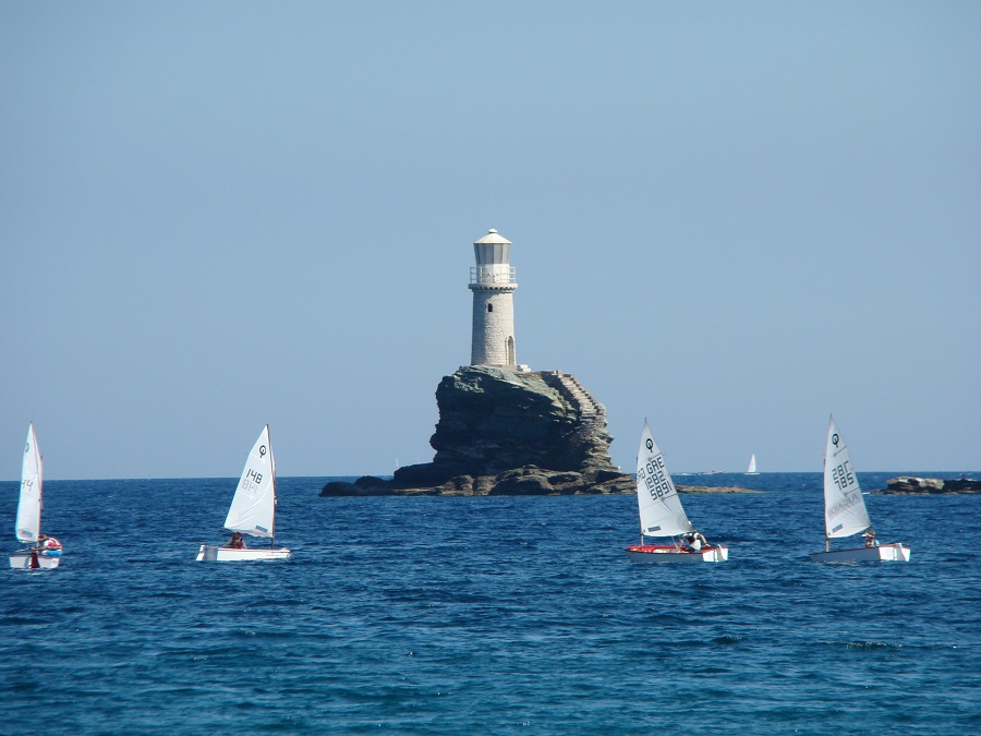 Μεσημέρι στην Χώρα. Τα ιστιοπλοϊκα του ΝΟΑ μπροστά στον ξεχωριστό Τουρλίτη.