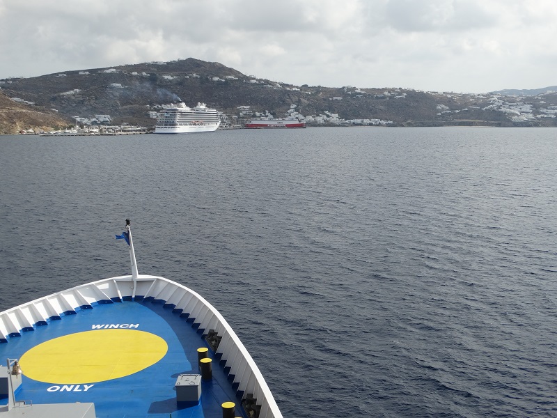 Τρίτο λιμάνι. πάλι κλασικά, η Μύκονος. Κλασικά εκεί μας περίμενε ένα κρουαζιερόπλοιο και ο τακτικός Θεολόγος. (φωτ. Εν Άνδρω).