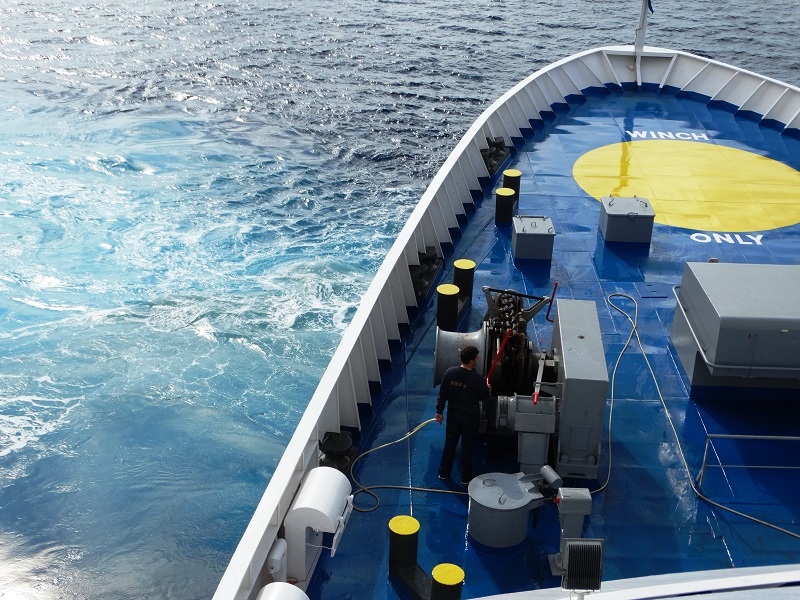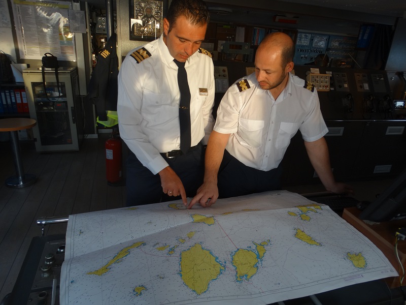 Και επειδή το Superferry II δεν πάει κάθε μέρα από Άνδρο για Σαντορίνη οι καπετάνιοι ανοίξαν χάρτες να περάσουν τα στίγματα στο ηλεκτρονικό ραντάρ του πλοίου. Εδώ ο πλοίαρχος καπετάν Θανάσης Χαλάς με τον καπετάν Παναγιώτη βρίσκουν το στίγμα της Σαντορίνης στον μεγάλο ναυτικό χάρτη των Κυκλάδων. (φωτ. Εν Άνδρω).