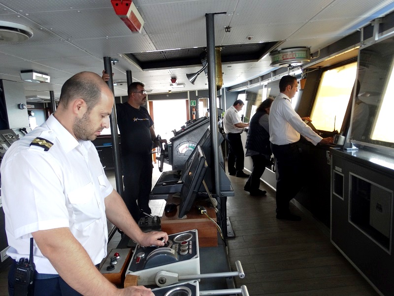 Το πλήρωμα της γέφυρας επί το έργο. Αρχίζει το έκτακτο μέρος της διαδρομής. Πάμε για Σαντορίνη να πάρουμε καμιά εκατοστή Σαντορινιούς που θα επισκεφθούν την Τ¨ηνο και την Παναγία και την Άνδρο και την Πανάχραντο. Είδες χειμερινός ενδοκυκλαδικός προσκυνηματικός τουρισμός; Ανάμεσα στο πλήρωμα της γέφυρας και ο καπετάν Τάσος Τρέσσος που βρήκε ευκαιρία για... προσκύνημα στη Σαντορίνη αυτός!!! (φωτ. Εν Άνδρω).