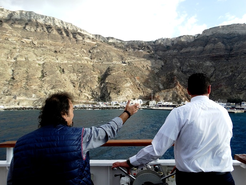 Ρίξαμε άγκυρες. Πήραμε και 9 επιβάτες για Σαντορίνη!!! Τόσοι έμαθαν την έκτακτη προέκταση του δρομολόγιου για Σαντορίνη. Βγάλαμε αναμνηστικές φωτογραφίες και συνεχίσαμε (φωτ. Εν Άνδρω).