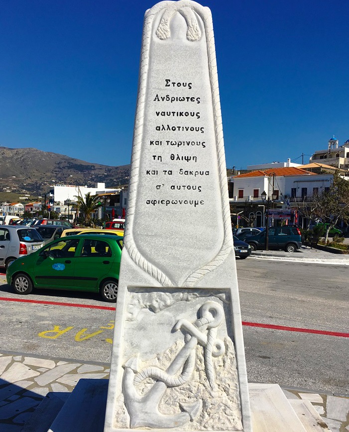 Μνημείο για τους χαμένους ανδριώτες ναυτικούς στο Γαύριο. Στήθηκε το 2004 από τον Δήμο Υδρούσας στη μνήμη του ναυαγίου του "Χρυσή Αυγή" (φωτ. Π.Κ.)