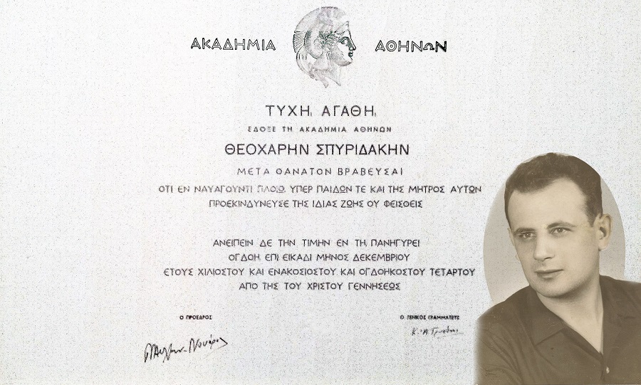 Το βραβείο της Ακαδημίας Αθηνών για τον ηρωισμό του Θ. Σπυριδάκη και η φωτογραφία του (σύνθεση Εν Άνδρω - αρχείο οικ. Σπυριδάκη).