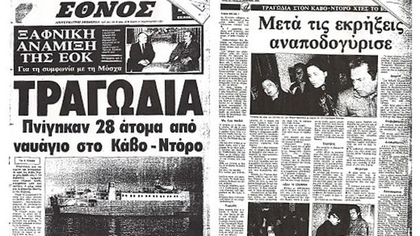 Δεν τον ξέχασα. Και δεν με ξέχασε. Έτσι στις αρχές Φλεβάρη κλείσαμε ραντεβού στο Γαύριο. Με περίμενε στην παραλία: σοβαρός κι ευγενικός. Καθίσαμε σε ένα γραφείο και τον άφησα να περιγράψει με λιτότητα τη βραδιά που το πλοίο με το οποίο ταξίδευε τυχαία ως επιβάτης μετράπηκε στον Κάβο Ντόρο σε κόλαση φωτιάς και θανάτου. Μια νύχτα της οποίας την έκταση της τραγωδίας, όπως είπε, συνειδητοποίησε μόνο το επόμενο πρωί. Ας παρακολουθήσουμε την δική του αφήγηση στα συμβάντα εκείνης της μοιραίας νύχτας…