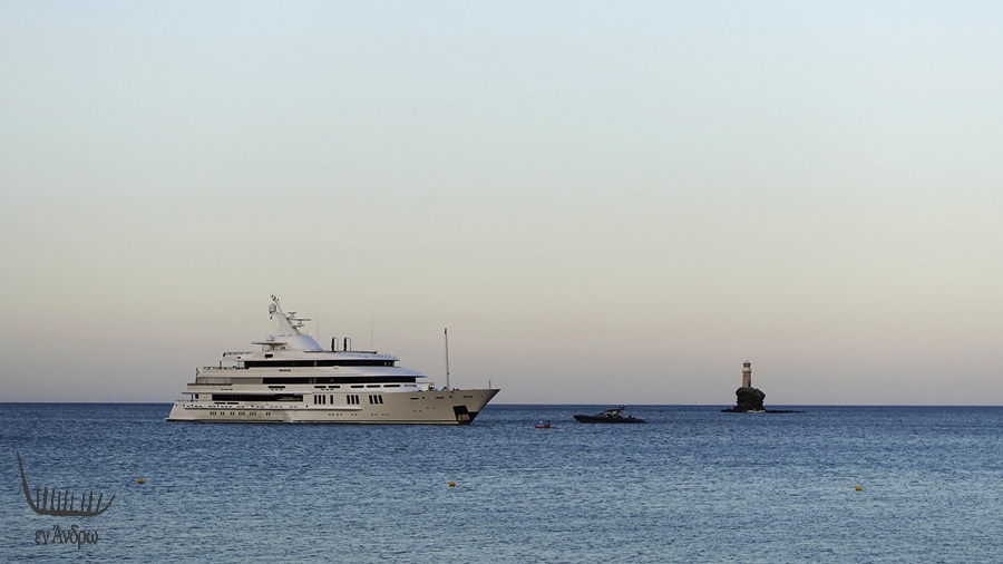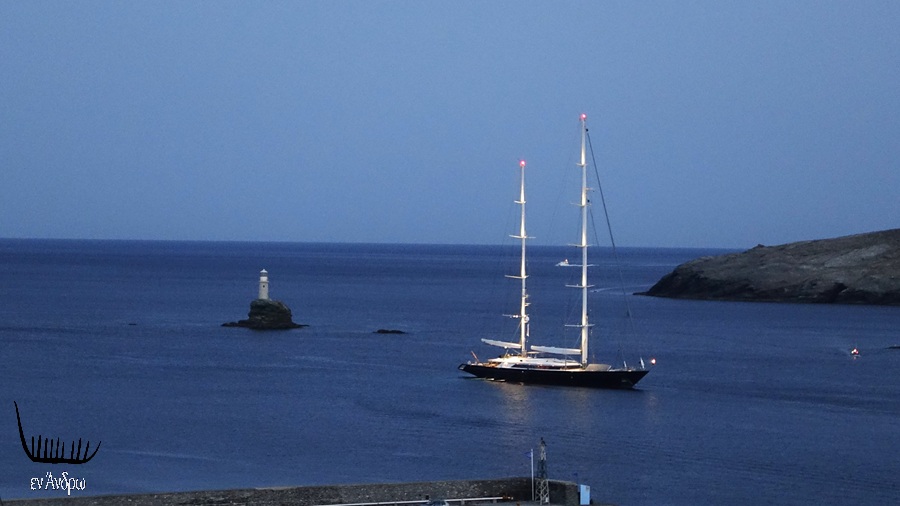 Ήρθε και το επιβλητικό δικάταρτο κι αγκυροβόλησε μπροστά στον φάρο της Χώρας. Είχε πάει στα Άχλα την μέρα. Κι επέστρεψε για το βραδινό πάρτι στον Όμιλο. Ο ΝΟΑ της Άνδρου για 2-3 μέρες ντύθηκε στα καλά του για το 58ο Ράλι που φέρει το όνομα του δημιουργού του...