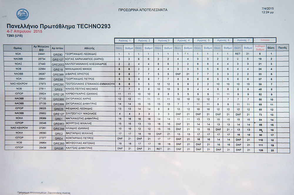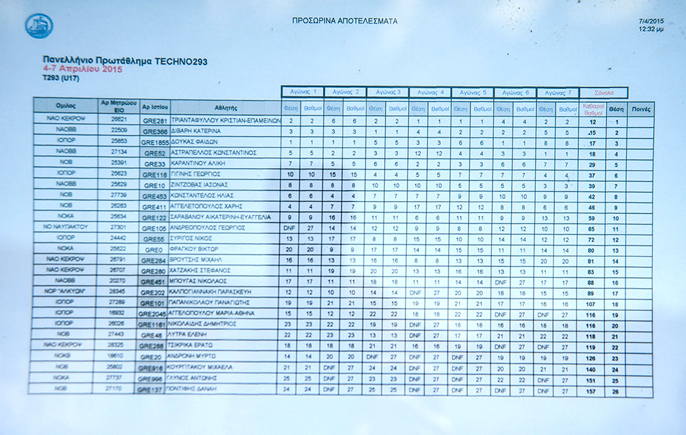 Ολοκληρώθηκε με επιτυχία την Τρίτη 7 Απριλίου το μεσημέρι το Πανελλήνιο Πρωτάθλημα Windsurf  Techno 293, που ξεκίνησε το Σάββατο 4 Απριλίου στον Όρμο Κορθίου Άνδρου. Εκτός την Δευτέρα, που αναβλήθηκαν λόγω δυνατών ανέμων, οι κούρσες τις υπόλοιπες μέρες πραγματοποιήθηκαν κανονικά διαμορφώνοντας την παρακάτω τελική κατάταξη.