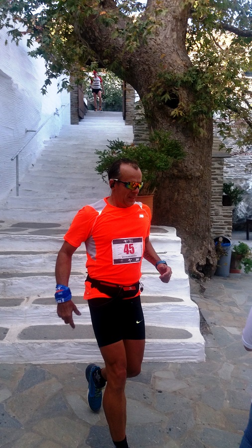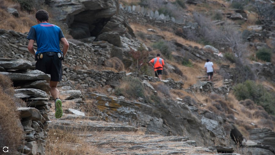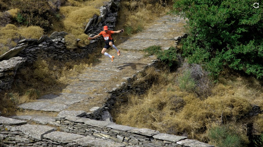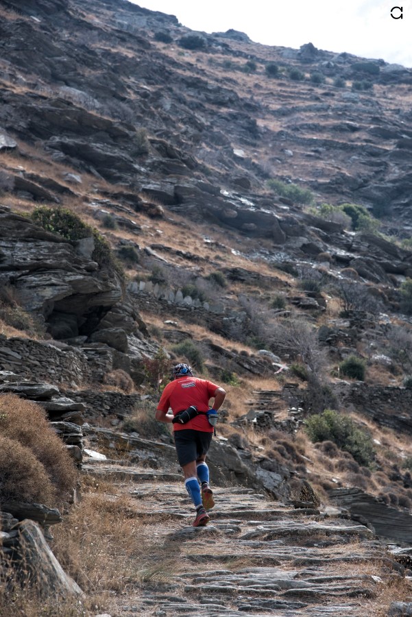 Στην ίδια διαδρομή άλλος αθλητής ανηφορίζει το πέτρινο μεσαιωνικό μονοπάτι της Άνδρου (φωτ. Δ. Αντωνέλλος).