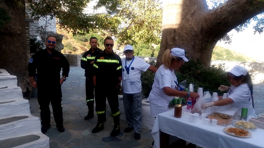 Σταθμός ανασυγκρότησης στο μοναστήρι της Παναχράντου. Εθελοντές και πυροσβέστες. Μαζί και ο Χρήστος Παπαϊωάννου από την πυροσβεστική, Θωμάς από το Κόρθι και ο Δημήτρης Λάσκαρης από την Χώρα. (φωτ. Ι.Μ.Παναχράντου).