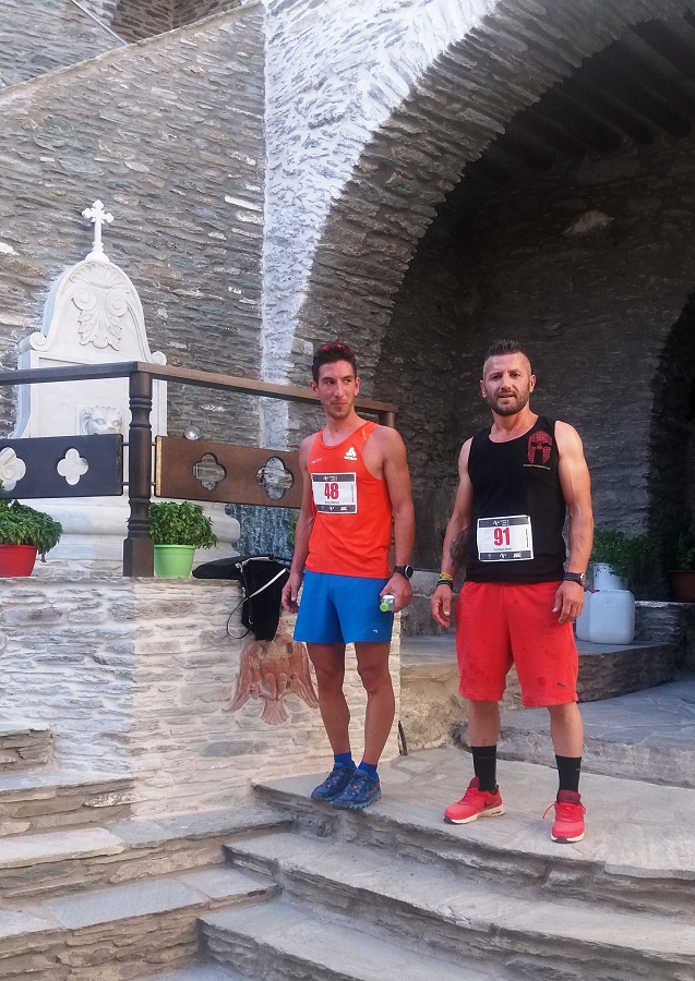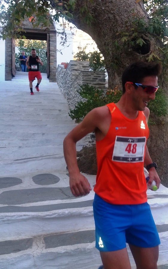 Ο Γιώργος Μπάτας που βγήκε πρώτος στα 22 χιλ. κατεβαίνει τρέχοντας την σκάλα για το προαύλιο της Μονής (φωτ. Ι.Μ.Παναχράντου).