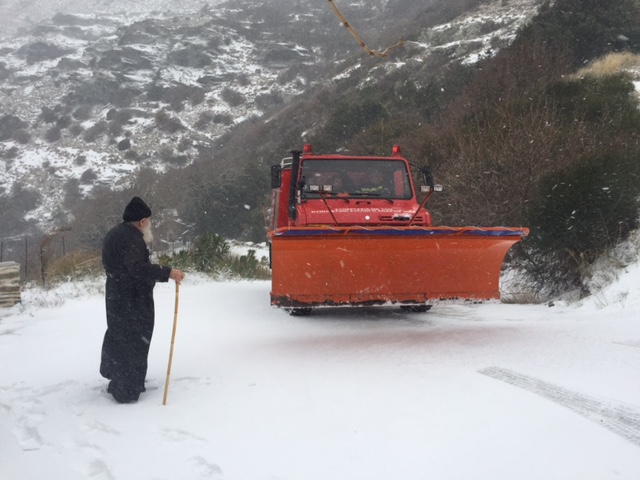 Θα ανοίξει ο δρόμος για την χιονισμένη Πανάχραντο να φύγουν οι επισκέπτες αργότερα... (φωτ. π. Φιλάρετος)