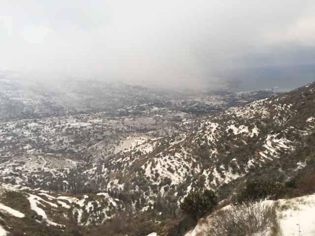 Το χιόνι έχει σταματήσει για λιγο. Διακρίνοται το χιονισμένο Πέταλο και τα χωριά στις πλαγιές του. Κάτω η Μεσαριά. (φωτ.π. Φιλάρετος).