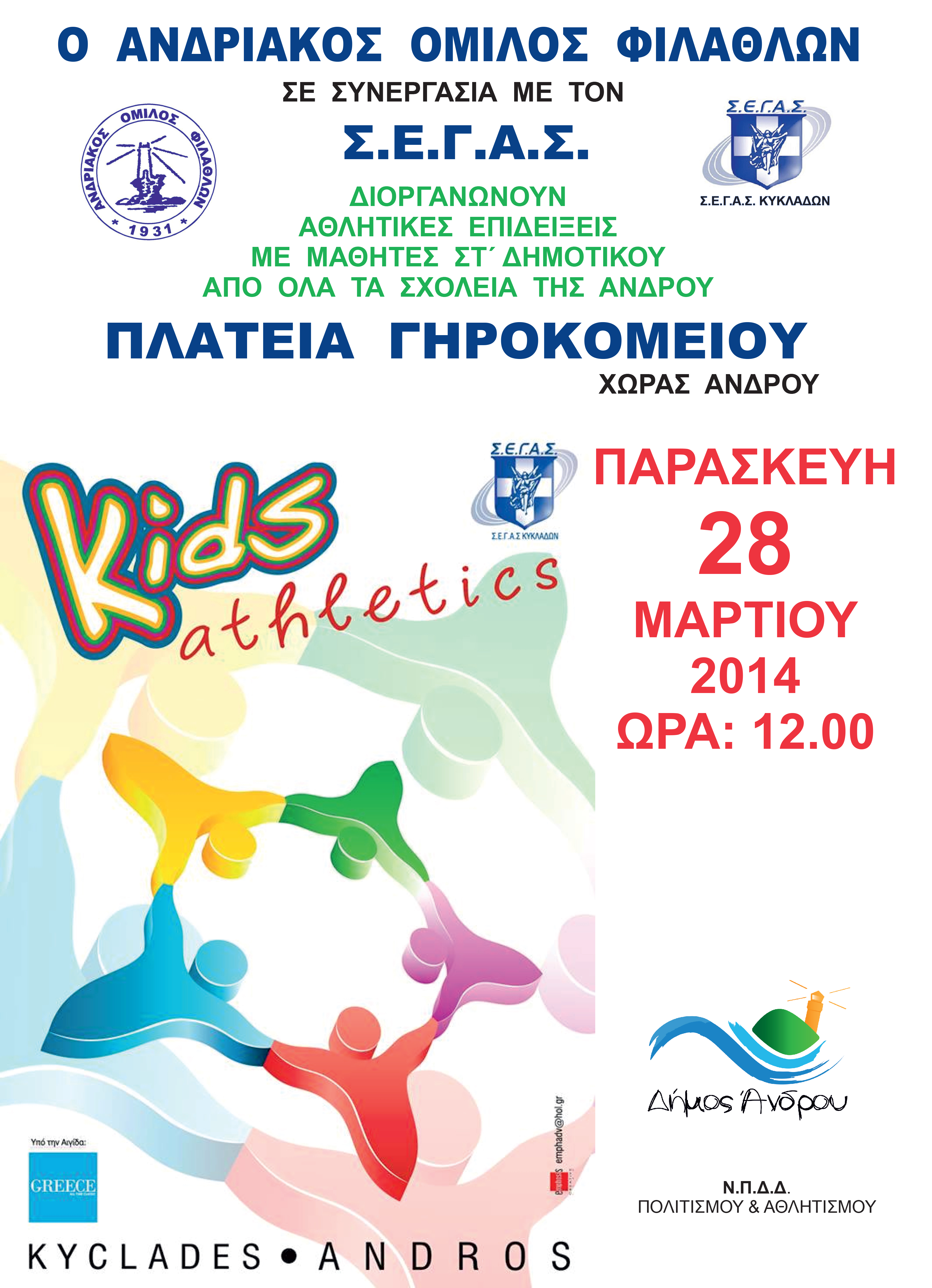 Ο Ανδριακός ΟΦ σε συνεργασία με τον ΣΕΓΑΣ διοργανώνει αθλητικές επιδείξεις για παιδιά 6ης Δημοτικού από όλα τα σχολεία της Άνδρου. Η εκδήλωση θα πραγματοποιηθεί στην κεντρική πλατεία Γηροκομείου, Η παρουσία όλων θα βοηθήσει στην ανάπτυξη του Αθλητισμού στο νησί της Άνδρου.