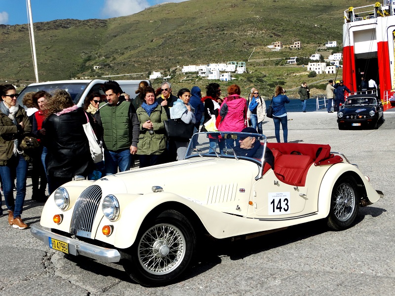 Ήρθαν στην Άνδρο μερικά από τα ωραιότερα αυτοκίνητα του κόσμου. Τι άλλο να πούμε; Από τα 75 αυτοκίνητα όλων των ειδών και όλων των εποχών μερικά ήταν ατόφια κομμάτια μουσείου. Ένα μουσείο στους δρόμους της Άνδρου. Και το εκπληκτικό δεν ήταν μόνο τα αυτοκίνητα. Αλλά ήταν και οι επιβαίνοντες που είχαν και ανάλογο στιλ. Εδώ μια λευκή MG στο Γαύριο με ένα ζευγάρι που λες και βγήκε από ταινία εποχής (φωτ. Εν Άνδρω).