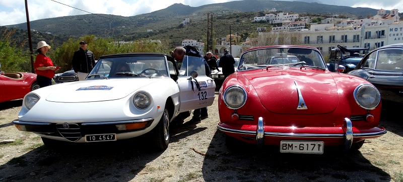 Στο υπαίθριο πάρκινγκ δύο-δύο οι κουκλες της ασφάλτου. Μοναδικές. Υπέροχες. Ξεχωριστές. Σπάνιες Εδώ μια κόκκινη Πόρσε και ένα ακόμα διαλεχτό κομμάτι (φωτ. Εν Άνδρω).
