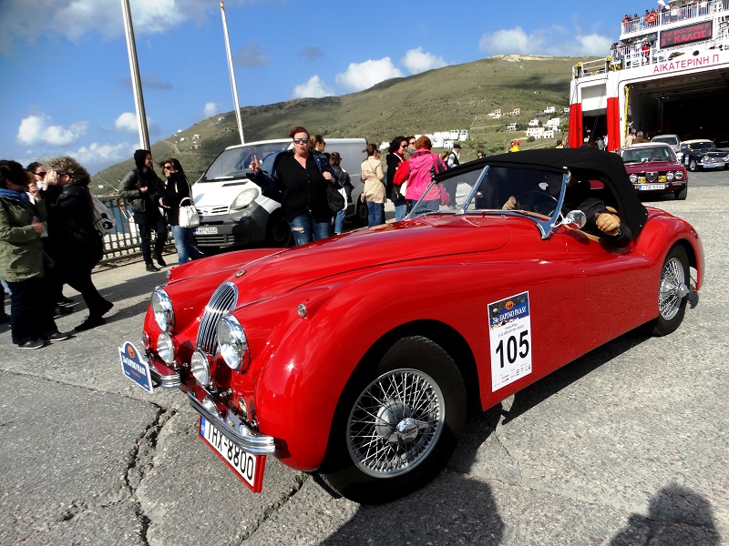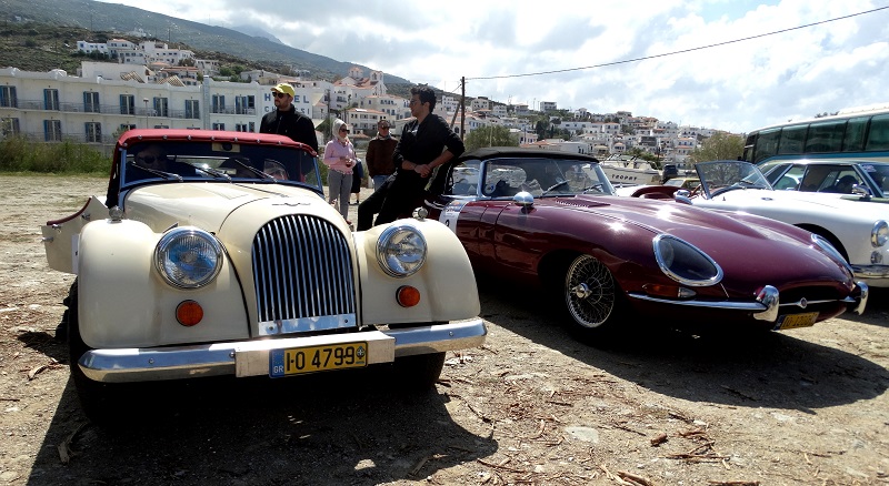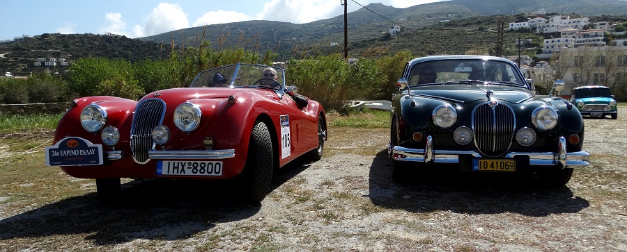 Εδώ δύο υπέροχες Τζάγκιουαρ της δεκαετίας του 1960 στο υπαίθριο πάρκινγκ στο Μπατσί πριν ξεκινήσει ο διήμερος αγώνας. Σήμερα ξεκίνησαν τον αγώνα από το Μπατσί. Πήγαν Κόρθι και κατέληξαν στην Χώρα Μετά ανηφόρισαν προς Στενιές για να γυρίσουν πίσω στο Μπατσί (φωτ. Εν Άνδρω).