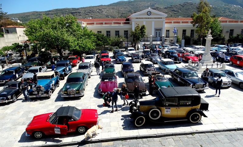 Στη νεοκλασική πλατεία, μπροστά στο νεοκλασικό Γηροκομείο των Εμπειρίκων μερικά... νεοκλασικά αμάξια!!! Μια πανοραμική φωτογραφία των 75 περίπου αυτοκινήτων που παρατάχθηκαν με ταξη και ευπρέπεια για να τα δει ο κόσμος. Όσος κόσμος ήταν εκείνη την ώρα στην πλατεία της Χώρας (φωτ. Εν Άνδρω).